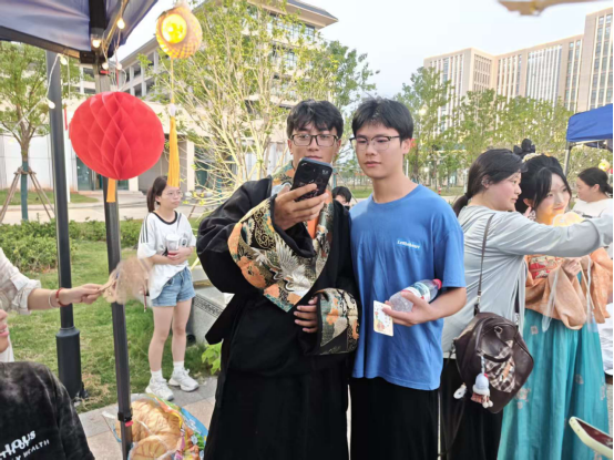 活动现场,兼具中秋韵味与民族特色的打卡点成为焦点:明月造型背景板前,身着汉服、藏族藏袍等服饰的同学们或单人定格风采,或三五成群合影留念。有的同学手持中秋玉兔、灯笼等传统元素道具,有的则以校园景致为衬,在快门声中记录下各族学子欢聚一堂的温馨画面,现场笑声与快门声交织,满溢着团圆祥和的节日氛围。