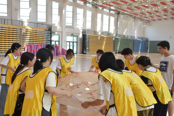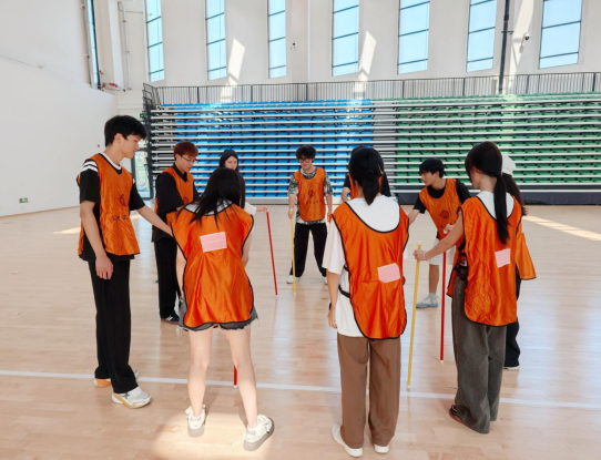 活动伊始,各班级代表队以充满创意与激情的团队风采展示,点燃了全场气氛。随后的心理素质拓展竞赛将红色教育理念付诸实践。各小队在六个模拟长征艰难险阻的拓展项目中协同完成“救援任务”。在“重走长征路”环节,队员们通过倾斜地图,共同引导象征医疗物资的小球沿路线前行,每一次成功都引发热烈掌声;“血墨诀别书”项目中,队员们合力操控绳尾,以中央毛笔在宣纸上留下坚定有力的字迹;“铁血渡险河”挑战则要求队员们借助三块砖头稳健前行,模拟当年渡河的艰险。整场活动通过沉浸式体验与紧密协作,使学生在实践中深刻感悟革命精神,增强了团队凝聚力与个人心理韧性。