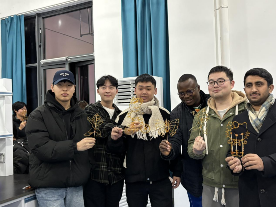 创作过程中,中外学子自然地交流起各自家乡的特色美食与传统文化。随着小组创作环节结束,形态各异、晶莹剔透的糖画作品呈现在大家眼前:憨态可掬的小马活灵活现,灵动的蝴蝶翅膀带着诱人的光泽,还有各种可爱的卡通形象……每一件作品都承载着创作者的巧思,更见证着中外学子之间的友谊。留学生举着自己和搭档共同完成的糖画兴奋地说:“没想到糖能做出这么精致的东西,制作过程特别有趣,和中国朋友一起合作也很开心!”